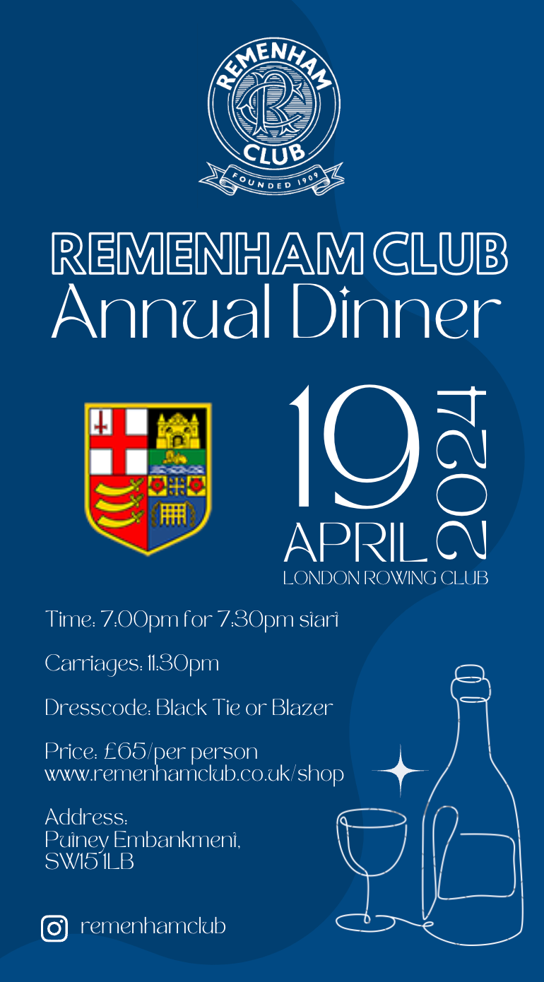 This year it is the turn of London RC to host the Annual Dinner. The event details are as follows: Remenham Club Dinner Annual Dinner to be held on Friday 19th April 2024 at: London Rowing Club, 7 Putney Embankment, London SW15 1LB Arrive 7pm for 7.30pm, carriages at 11.30pm Menu: Starter Chicken liver parfait with melba toast and chilli jam or Roasted butternut squash, baby spinach, watercress and feta salad Main Slow cooked beef with red wine, pancetta, field mushrooms, served with mash and crispy kale or Puy lentil, tomato, pecan and roasted mushroom ragu with brown rice Pudding Sticky toffee pudding (vegan option with vegetarian menu) Drinks List Dress: Black Tie or Club Blazer Dietary requirements or seating preferences to webenquiries@remenhamclub.co.uk . The majority of tables are for 10. Order online via the members' shop or waiting list shop .