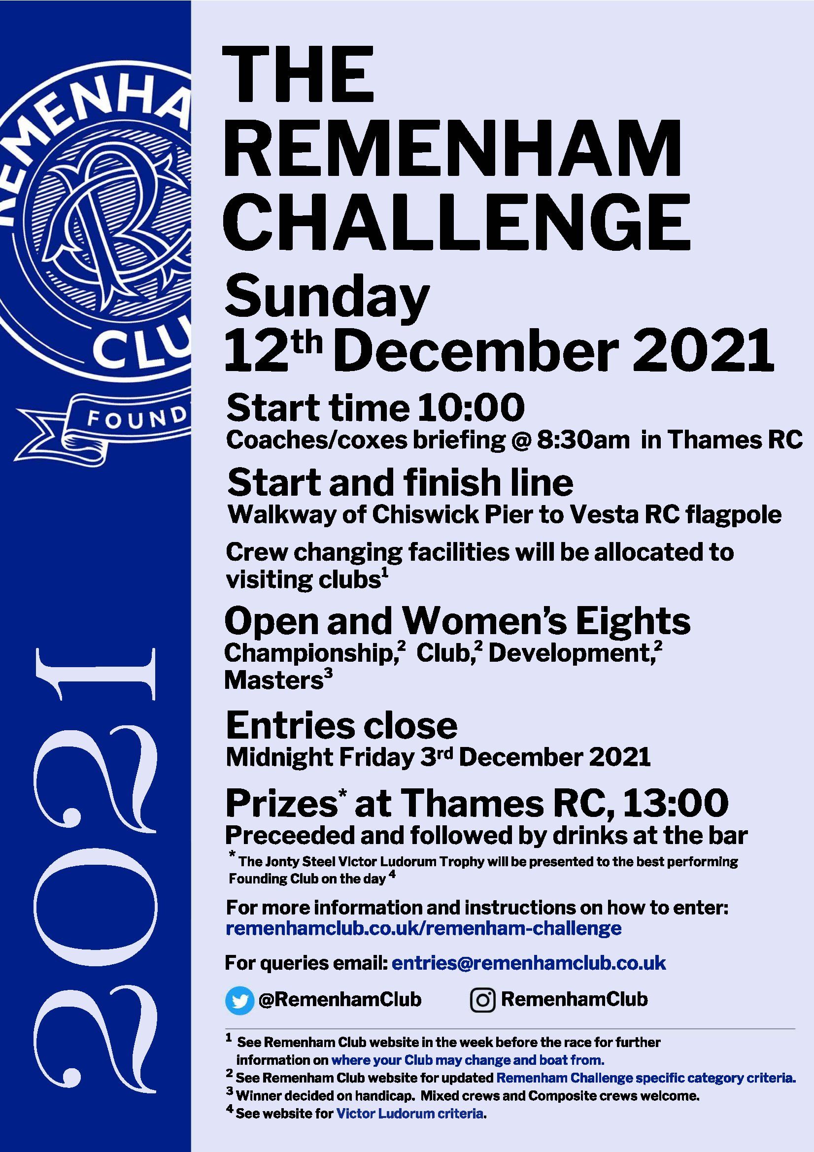 The Remenham Challenge 2021 will take place at 10am on Sunday 12th December between Chiswick Steps and Vesta Flag Pole. Details are available on the event page , the instructions to competitors is here , the race draw is here . Good luck to all competitors, the forecast is currently looking good as of noon Wednesday.